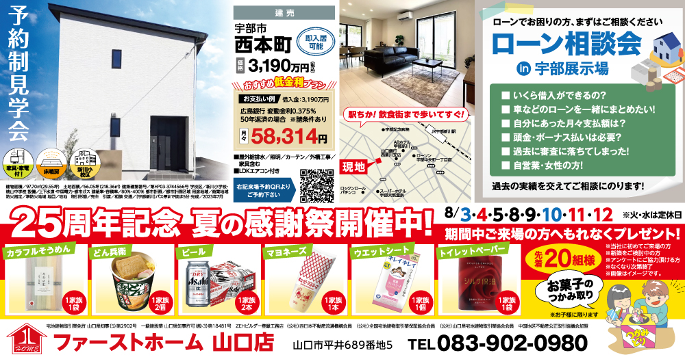 | 期間 | 終了 8月3日(土)~8月4日(日) | 備考 | ※お問合せは山口店(TEL:083-902-0980)にお願い致します。 【感謝祭の期間は、QUOカード特典対象外となります】 |