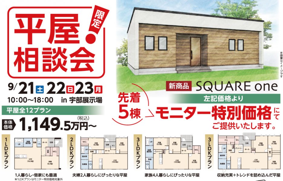 | 期間 | 終了 9月21日(土)~9月23日(月) | 備考 | ※お問合せは山口店(TEL:083-902-0980)にお願い致します。 |