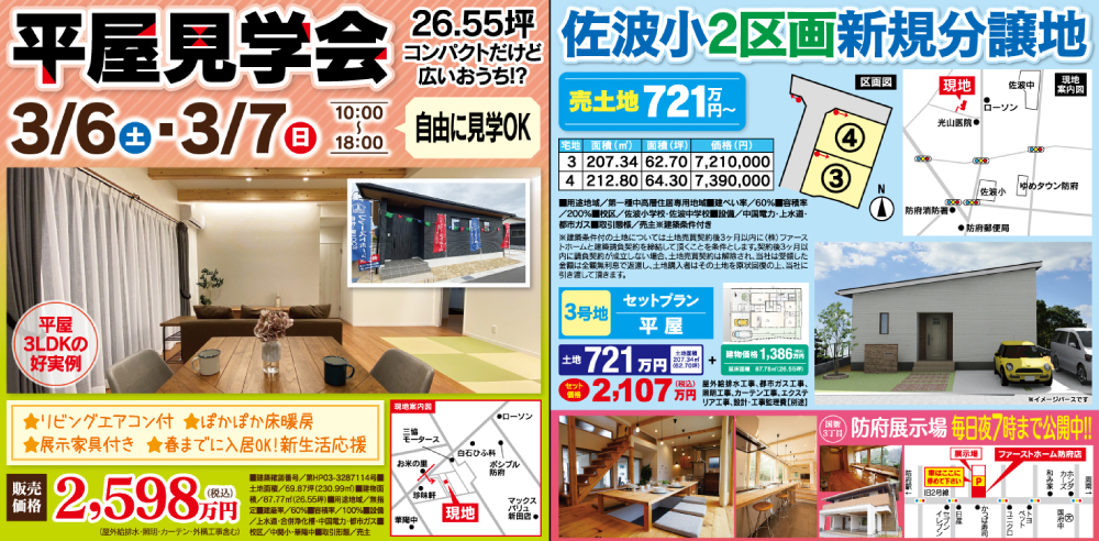 | 期間 | 終了 3月6日(土)~3月7日(日) | 備考 | ※お問合せは防府展示場にお願い致します(TEL:0835-26-4123) |