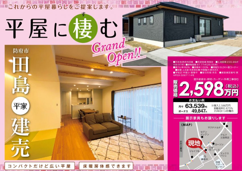 3LDK+畳スペース付きの平屋が防府市田島に登場!