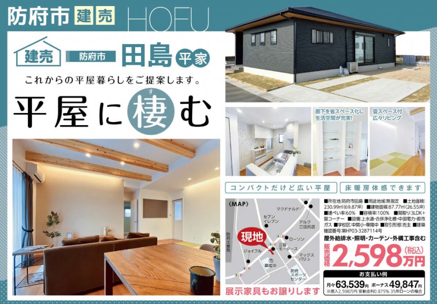 3LDK+畳スペース付きの平屋が防府市田島に登場!