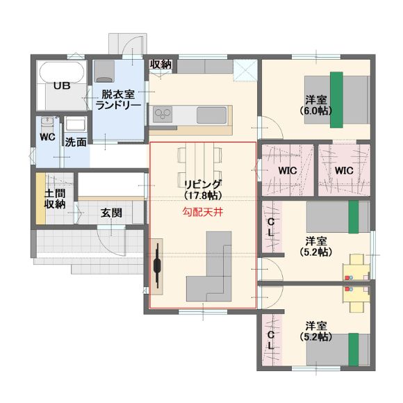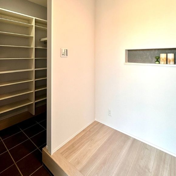 玄関横に大容量のシューズクロークを配置。靴やアウトドア用品をすっきり収納でき、玄関を常に綺麗に保てます。