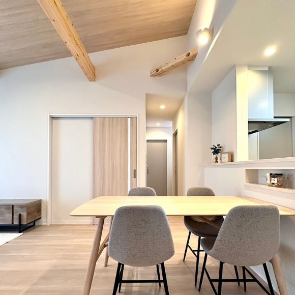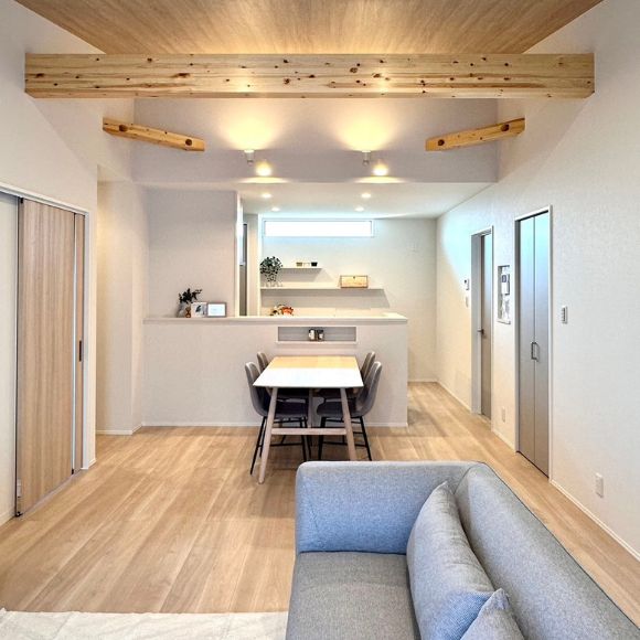 ダイニング・キッチンとリビングが一続きになった設計で、家族が自然と集まりやすい空間構成です。 -
