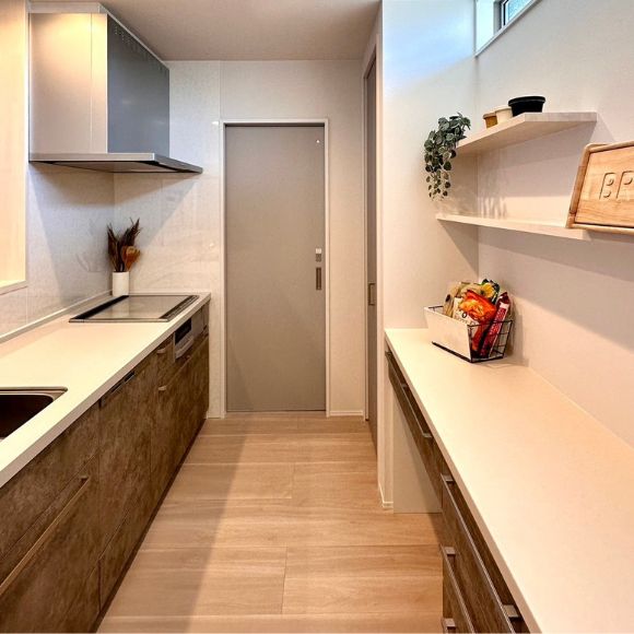 キッチンからそのままランドリールームへのアクセス可能な動線が、家事をスムーズに進められるポイントです。 -