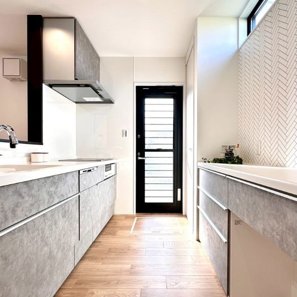 流行りのニュアンスカラーのグレーのキッチンにアクセントクロスがポイント!キッチン道具や食品をストックできる収納付き!